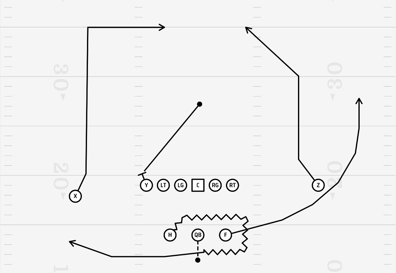 Pre-snap, the H goes in Orbit Motion, then releases on a Swing route after the ball is snapped. The F runs a Rail route which goes into the zone vacated by the Z on the Post/Over route. The Z stems inside and runs 10-12 yards before making his cut towards the post. On the backside, the Y chip blocks the defensive end, then runs 8-12 yards (depending on coverage) before sitting on the OTB route. The X receiver runs a Dig route, also stemming inside, and cutting at about 12-15 yards.